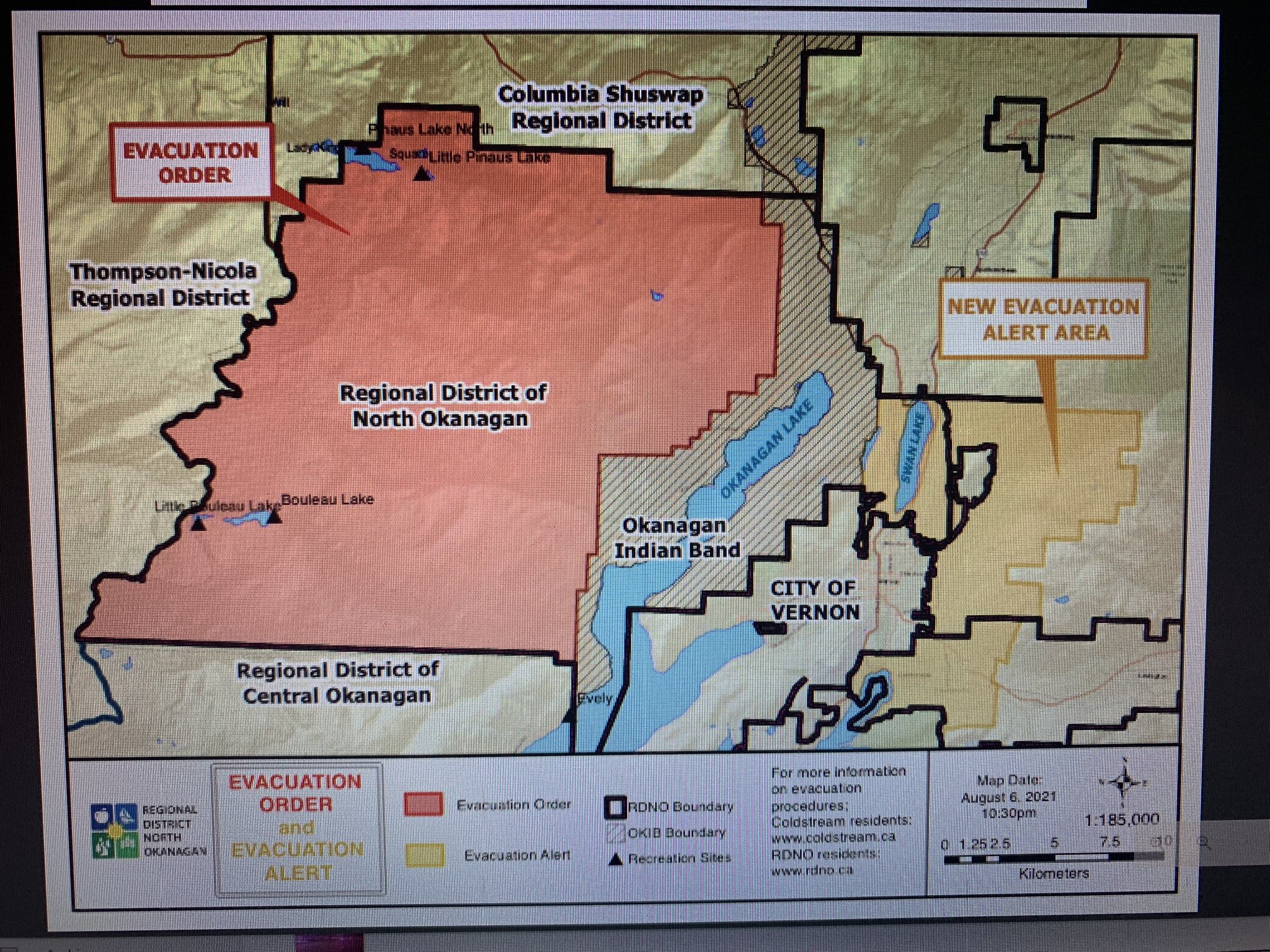 The white rock lake wildfire, last estimated at 32,000 hectares between vernon and kamloops, has prompted evacuation orders and alerts spanning four regional districts and one first nation. The city of vernon is expanding the current evacuation alert to include the balance of properties within the city of vernon, excluding: An additional evacuation alert covering a wide swath of vernon, all of the communities of spallumcheen and armstrong were also placed on alert due to the aggressive white rock lake wildfire. The city says it is advising residents of the canadian lake view estates, adventure bay, tronson road, rise, turtle mountain, and blue jay communities and … Vernon fire rescue services will be strategically circulating along tronson road and stationed through adventure bay and canadian lakeview estates throughout the evening of august 6, 2021, in the event of spot fires. On friday, an evacuation alert was issued for properties north of sugarloaf mountain. Residents under evacuation alert are encouraged to prepare for the possibility of evacuation. The city of vernon claims to have issued an evacuation alert for certain areas within the city limits northeast of okanagan lake because of the conflagration at white rock lake. The white rock lake fire burning between kamloops and vernon, b.c., has prompted an evacuation alert for most of the city of vernon, which has a population of around 40,000. The township of spallumcheen and the town of armstrong both issued the alert at 7:00 p.m. An evacuation alert had been expanded late friday night to include nearly the entire city of vernon, which has a population of about 40,000 people, but on saturday afternoon the city partially. The city of vernon is closely monitoring the situation and has issued the evacuation alert advising residents in the canadian lake view estates, adventure bay, tronson road, rise, turtle mountain and blue jay communities to be on heightened alert and prepare for the. Residents living in neighborhoods across the lake from where the fire burns over westside road are urged to prepare to leave on short notice.